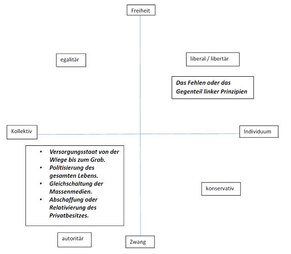 Ordnet man die politischen Positionen dagegen auf einem zweidimensionalen Schema ein, wird sofort deutlich, weshalb es immer wieder zu vermeintlichen Übereinstimmungen zwischen „lechts und rinks“ kommt. Die hier vorgeschlagene Einteilung, orientiert sich an einer vom Kollektiv zum Individuum gehenden x-Achse und einer vom Zwang zur Freiheit gehenden y-Achse. Fügt man den oben angeführten Katalog des als „links“ definierten Denkens in dieses Diagramm ein, ist sein Platz im linken unteren, als „autoritär“ definierten Quadranten. Hier finden sich gleichermaßen der Bolschewismus (mit stärkerer Ausprägung in Richtung Kollektiv) wie auch der Nationalsozialismus (mit stärkerer Ausprägung in Richtung Zwang).