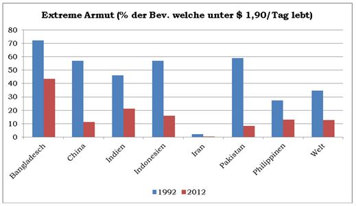 In Asien sind die Verhältnisse um einiges schlimmer, da man dort nach wie vor extreme Armutsraten jenseits der 40% finden kann. Nichtsdestotrotz kann auch in diesen Fällen eine profunde Verbesserung während der letzten 20 Jahre festgestellt werden. In China, zum Beispiel, ist die extreme Armut von 57% auf 11% zurückgegangen. In Indonesien ist die Rate ebenfalls von 57% auf 15% gefallen. Den geringsten Fortschritt gab es in Bangladesch, aber selbst dort hat sich die extreme Armut um fast 30 Prozentpunkte, von 72% auf 43%, reduziert.