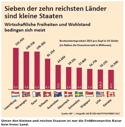 Politik wird nur besser und weniger, wenn sie Wettbewerb ausgesetzt wird – und das geht nur über kleinere politische Einheiten. In diesem Zusammenhang ist es hilfreich, sich das Pro-Kopf-Einkommen kleiner Nationen anzusehen; denn sieben der zehn reichsten Länder der Welt sind kleine Staaten. Ebenfalls aufschlussreich: die Liste der Länder mit der höchsten wirtschaftlichen Freiheit, erstellt von der Heritage Foundation in den USA. Spitzenreiter sind Hongkong, Singapur Neuseeland und die Schweiz. Relativ weit abgeschlagen auf Rang 26 findet sich Deutschland, Frankreich nimmt gar Platz 72 ein, Italien 79.