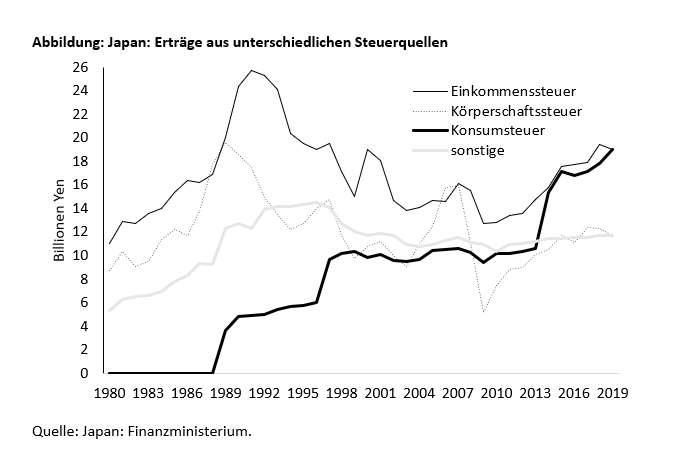 Blieb also nur die Konsumsteuer, auch deshalb, weil sie im internationalen Vergleich (Deutschland: 19% und Frankreich: 20%) immer noch gering ist. Auch ohne weitere Erhöhungen wird die Konsumsteuer damit spätestens dieses Jahr zur wichtigsten Einkommensquelle des japanischen Staates werden. Zwar waren die Einnahmen von Konsum- und Einkommensteuer im Jahr 2019 noch ungefähr gleich (siehe Abbildung), doch wird die Erhöhung auf 10% im Oktober 2019 dieses Jahr ihre volle Wirkung entfalten. Zudem dürften mit der Corona-Krise die Löhne wieder unter starken Druck geraten, so dass wie in den vorangegangenen Krisen die im Vor-Corona-Boom deutlich angewachsenen Erträge aus der Einkommenssteuer nun stark schrumpfen dürften.